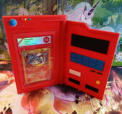 Après gradation, votre carte sera placée dans un pokédex réalisé sur-mesure par un artisan.